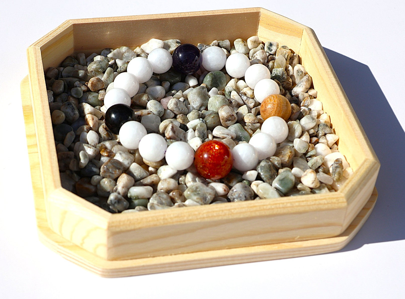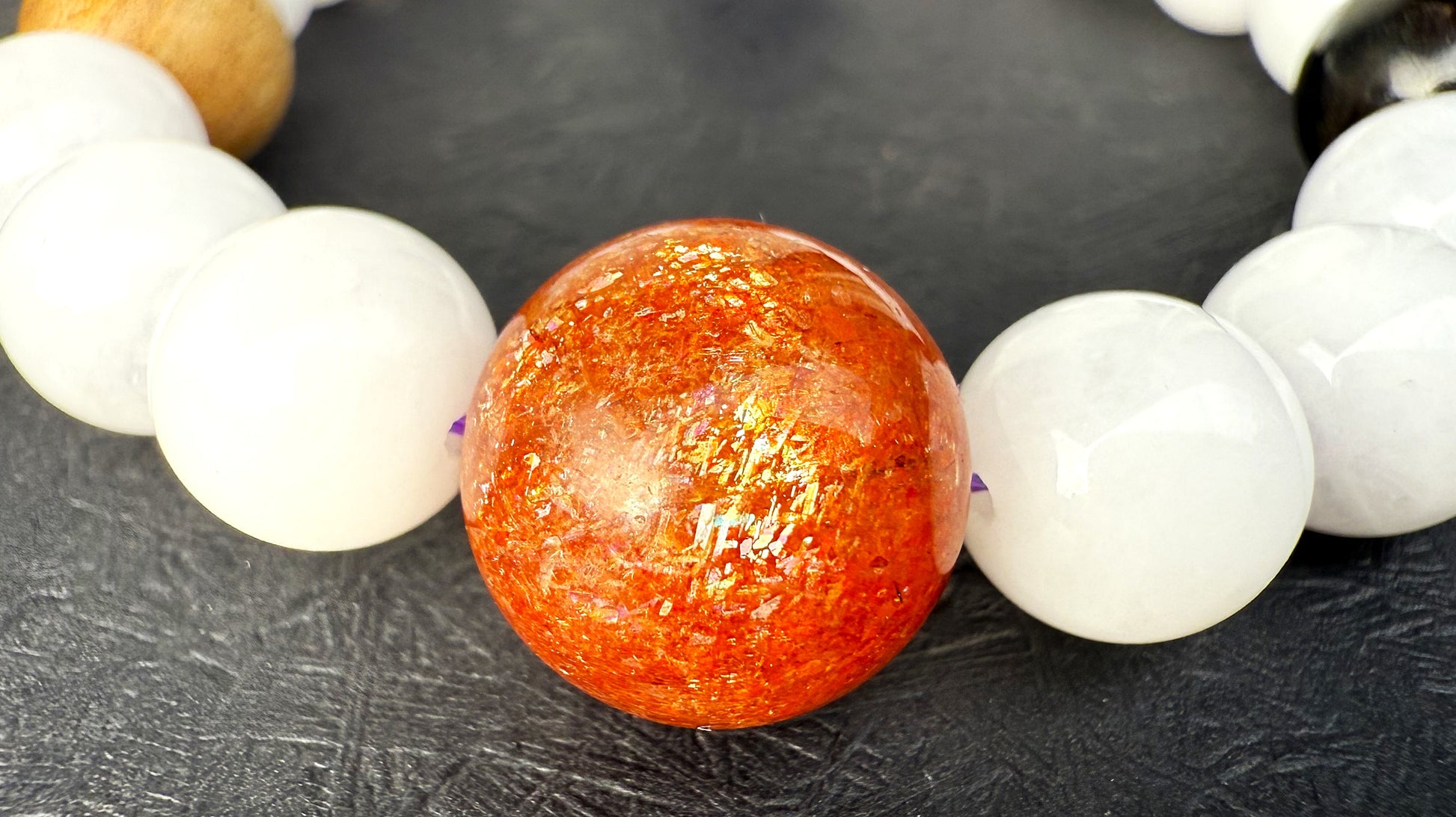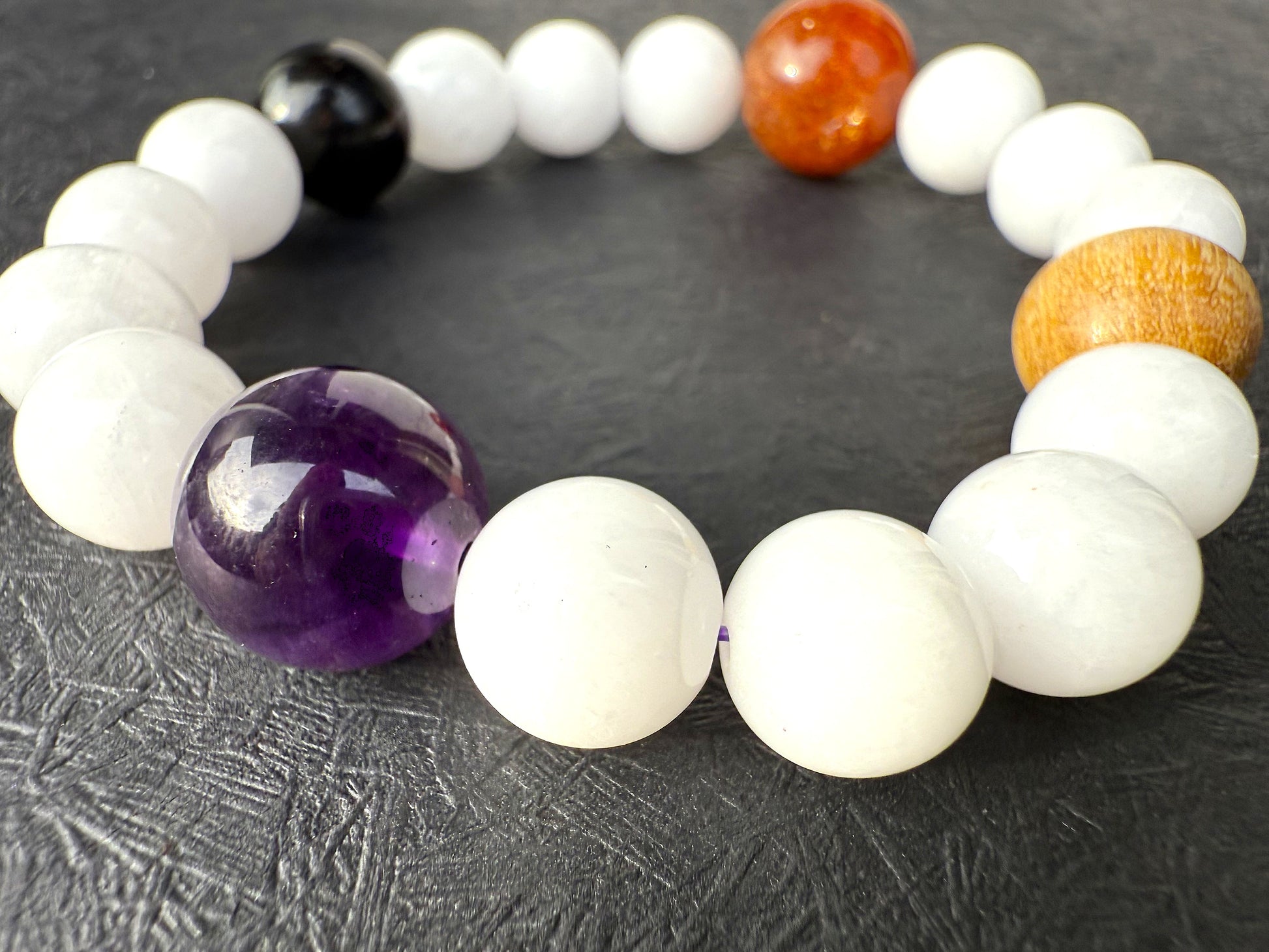 サンストーン・黒檀・白檀・アメジストといった霊性・守護・行動力を象徴する石を組み合わせ、